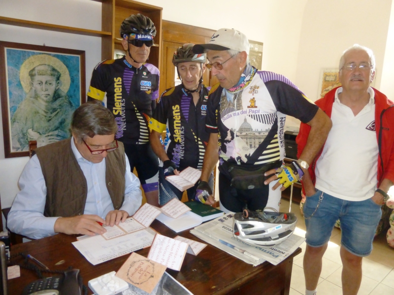 La vidimazione della Credenziale del Pellegrino, il documento che attesta alla persona che ne è in possesso la partecipazione ad un pellegrinaggio verso un luogo di culto, tenutasi questa mattina presso l’Ostello della Parrocchia di Santa Maria in Betlem, effettuata dal parroco don Lamberto Rossi, ha dato inizio al ciclopellegrinaggio che da Pavia porterà i nostri ciclisti a Roma nell’Anno Santo del Giubileo della Misericordia.